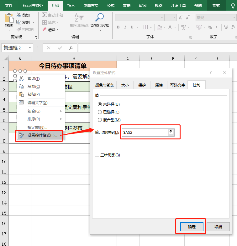 鼠标右键点击复选框,选择【设置控件格式】,在新窗口中,单元格链接设置为复选框所在的单元格;