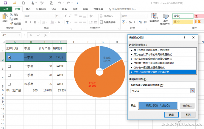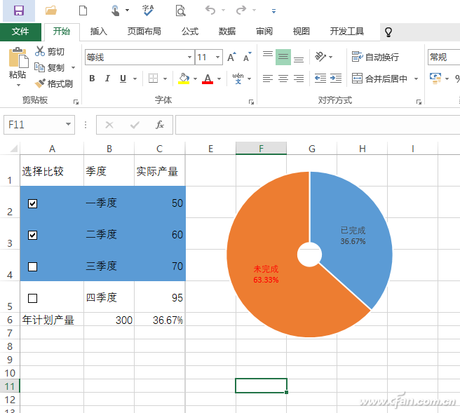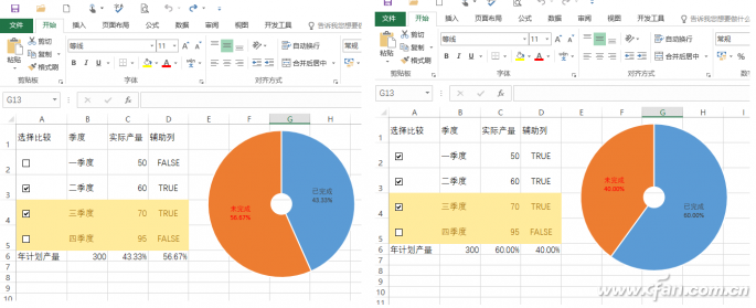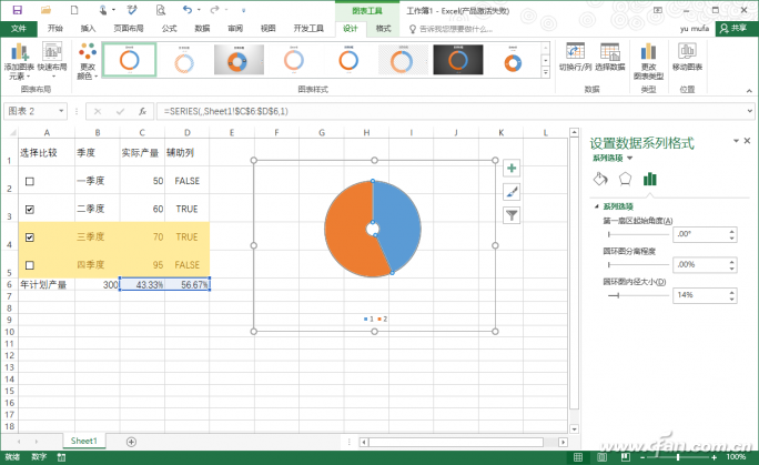 可以看到这个圆环图实际上是由C6(选中实际产量值/计划产量百分比)和其余数(1-百分比)组成的,因此当我们在原始数据栏选中需要统计的数据时,图表就会进行动态的变化。比如现在可以任意选择1个或几个季度的数据,选择后可以非常直观看到图表的变化(图10)。