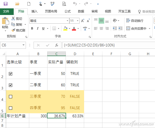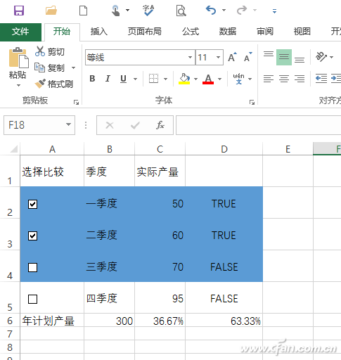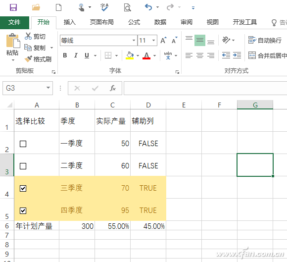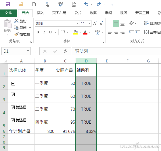 返回Excel,此时如果我们对单元格的复选框进行选择,可以看到选中/未选中后,D列对应的单元格值会变为True/Flase,这样借助插入的复选框我们就可以实现对项目产量值的灵活选择了(图4)。
