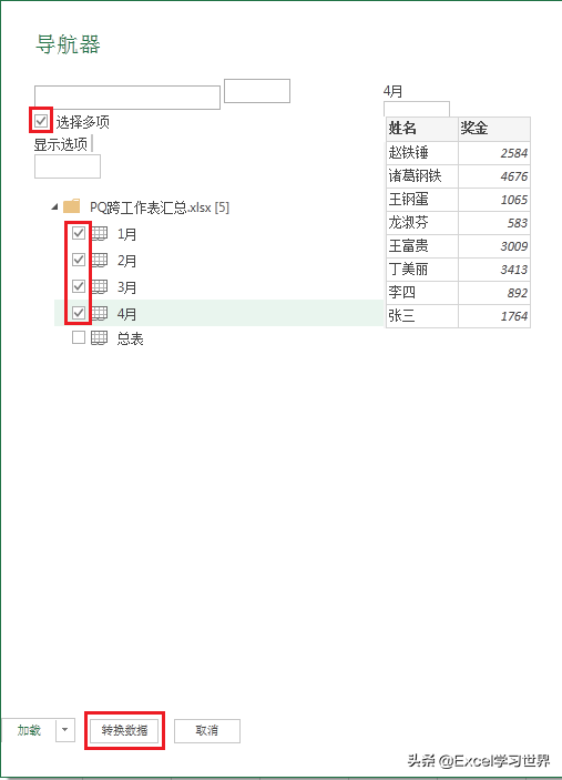 2. 在弹出的对话框中勾选“选择多项”--> 勾选“1月”至“4月”--> 点击“转换数据”