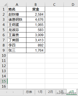 下图的工作簿中,每个月有一个单独的工作表,记录了当月在职员工的奖金数,如下图 1 至 4。