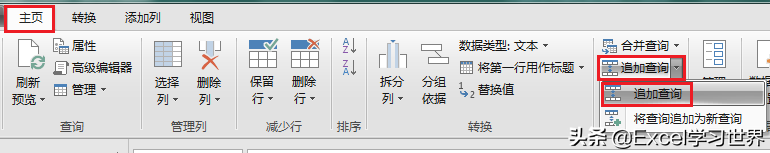 3. 选择菜单栏的“主页”-->“追加查询”-->“追加查询”