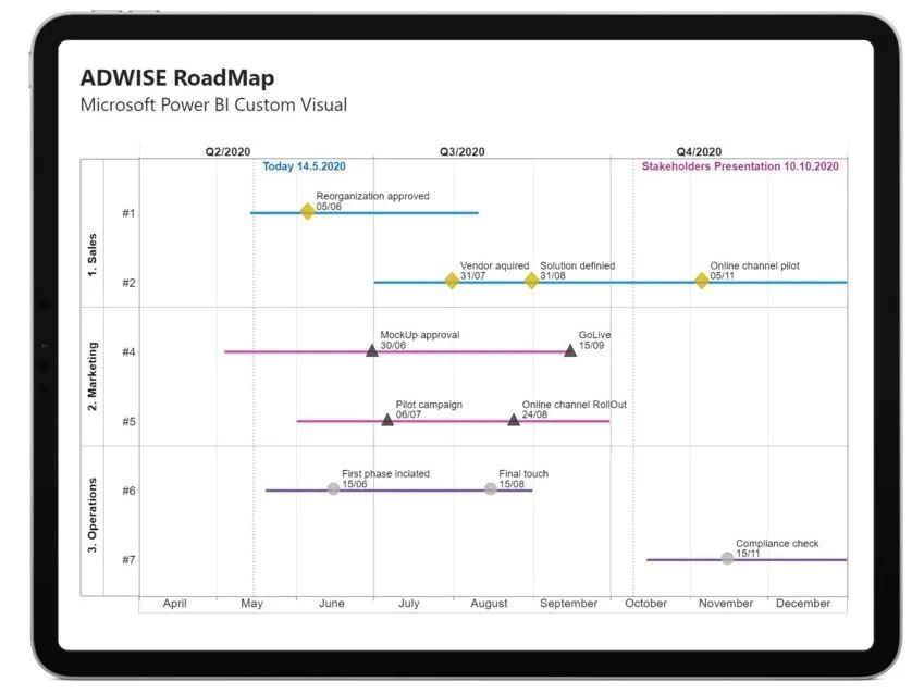 使用ADWISE路线图计划,路线图以及时间表阶段和里程碑。这种视觉效果可以帮助您展示您的项目,产品或活动计划,或者可以安排其他时间表的计划。