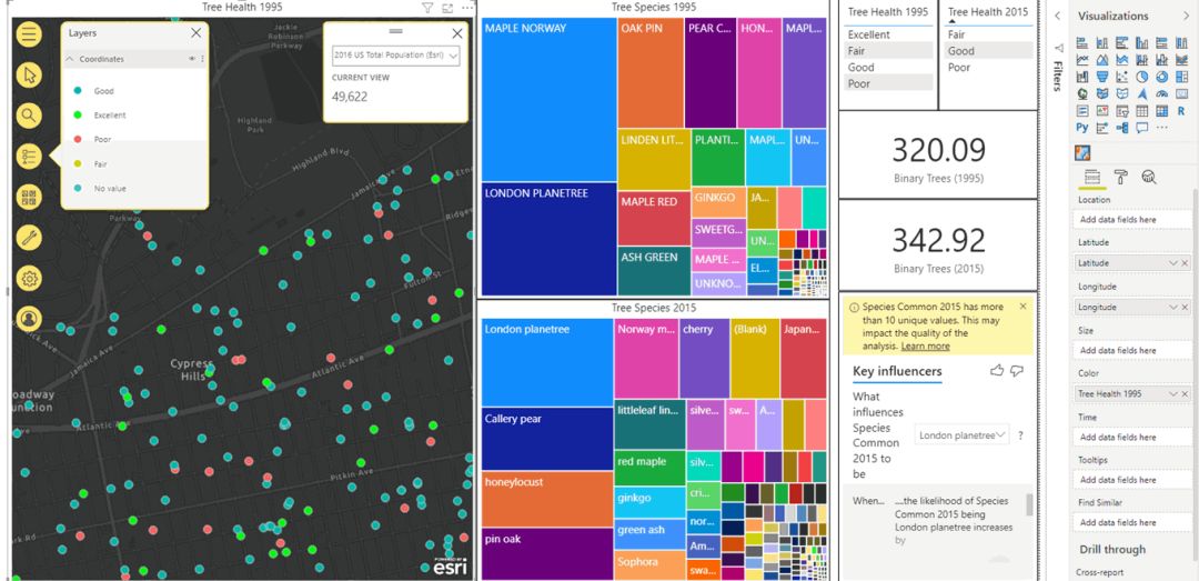 在此版本中,Power BI改进了ArcGIS Maps for Power BI的智能地图功能。智能映射功能会自动分析您的数据并提出数据驱动的样式建议,从而减少您的猜测。现在,有了改进的色带,您可以更清晰地可视化在地图上划分数据的不同类别。您还可以制作更准确的热图,以清楚地标识具有最大属性密度的位置。此外,现在,当您将地址很好地拖到位置字段时,可视化对象会自动检测数据类型并在地图上适当地创建多边形或点。