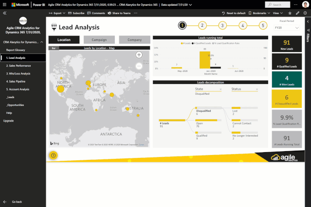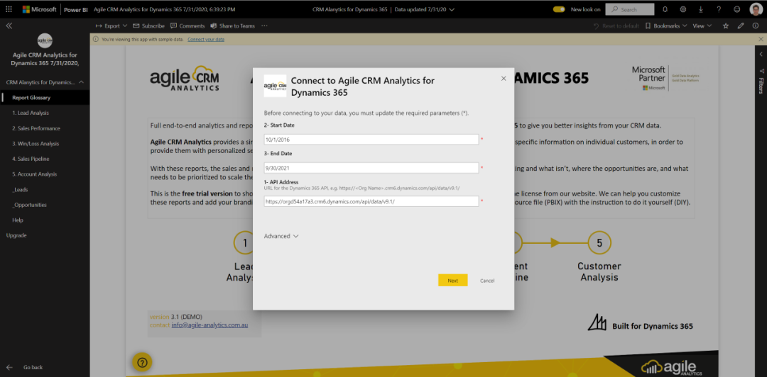 敏捷CRM分析是Microsoft Dynamics 365的一组Power BI分析报告,可让您从CRM数据中获得更好的见解。这是一个免费的试用版,向您展示可能性并进行试驾。