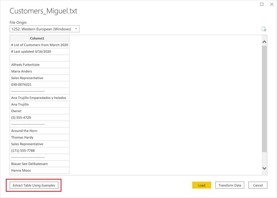 单击该新按钮后,您将进入“使用示例提取表”体验,该操作使您可以为要从Text / CSV文件中提取的数据指定示例输出值。