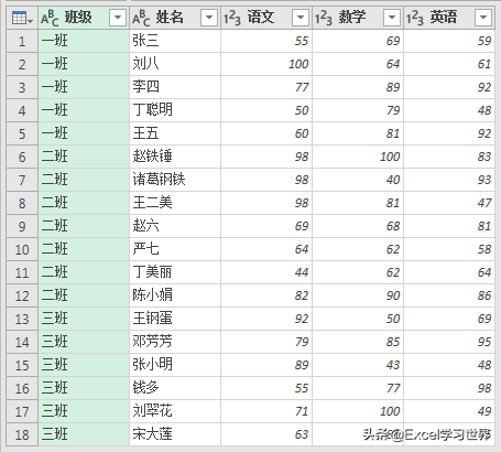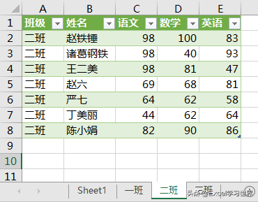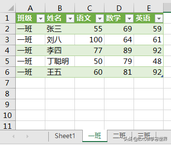 下图 1 是学生的各科成绩,请按班级把数据表拆分到不同的工作表中。效果如下图 2、3、4 所示。