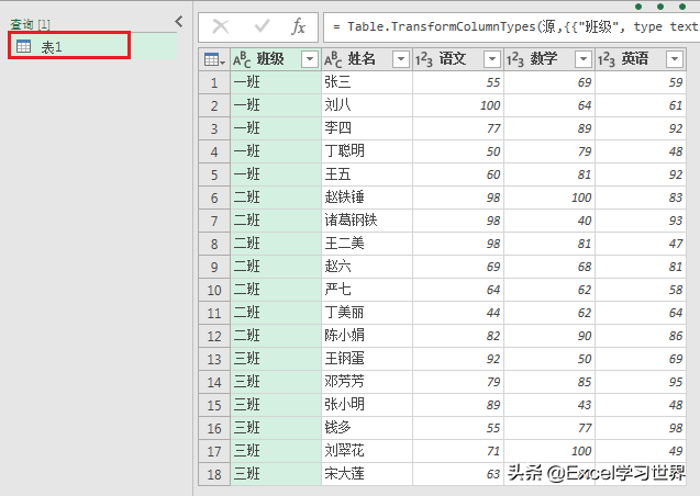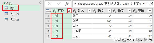 4. 选中“表1”--> 在“班级”列筛选“一班”