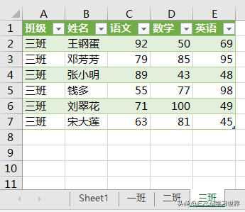 7. 将三个工作表的名称分别改为“一班”、“二班”、“三班”,数据表就按要求拆分好了。