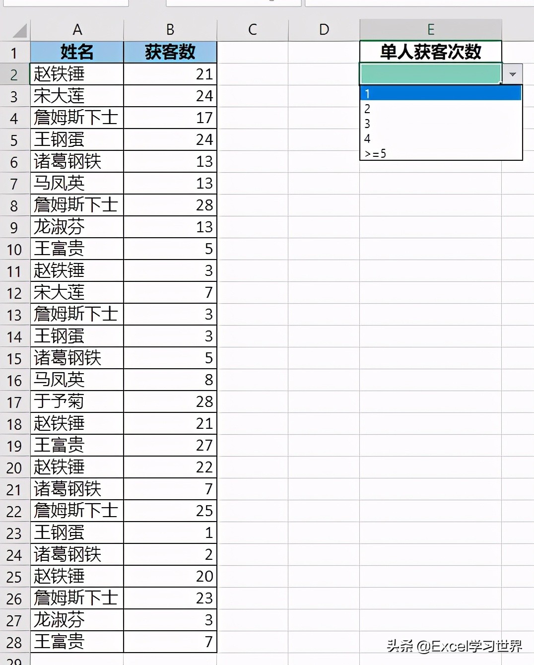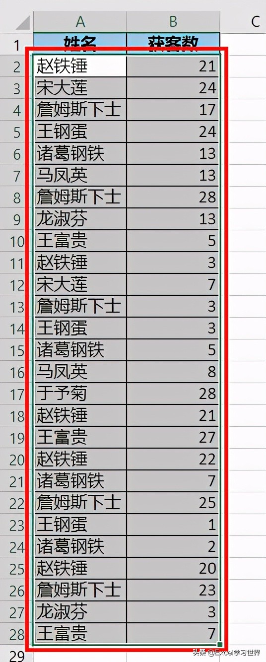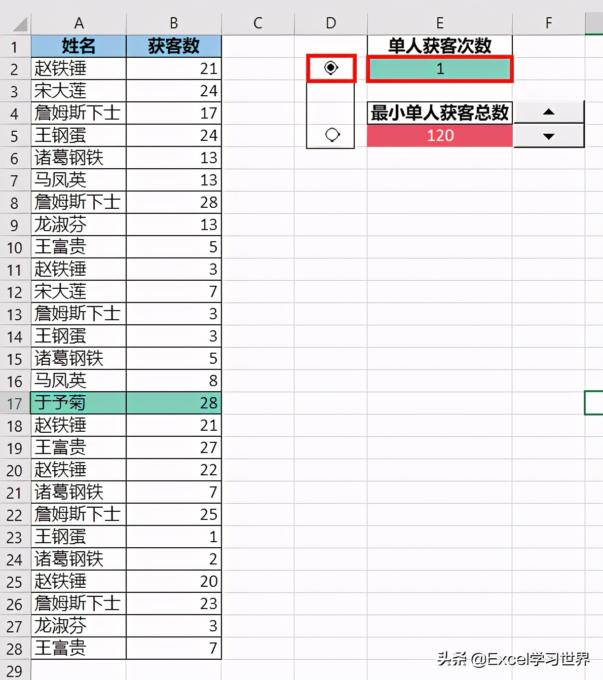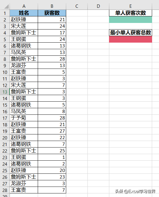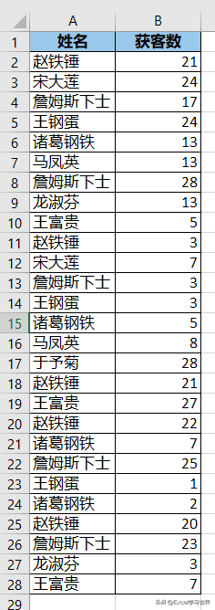 - SUMIF($A$2:$A$28,$A2,$B$2:$B$28):计算 A 列中姓名为 A2 的人的获客数之和;