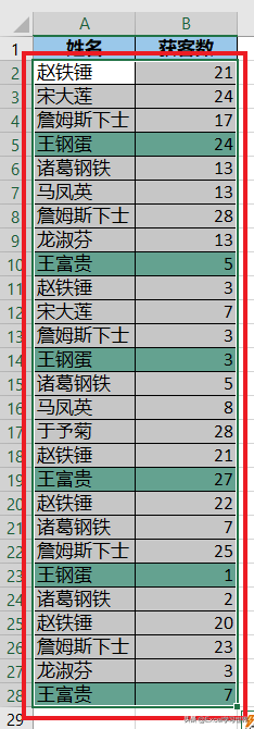 22. 再次选中 A2:B28 区域 --> 选择菜单栏的“开始”-->“条件格式”-->“新建规则”