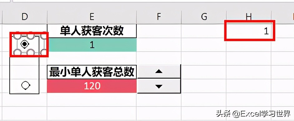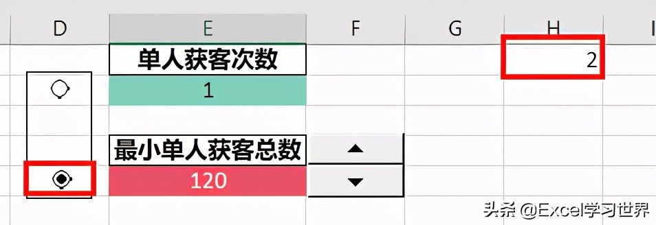 现在 H1 单元格就和选项按钮联动了,选中上面的单选钮,H1 显示 1,选中下面的,则显示 2。