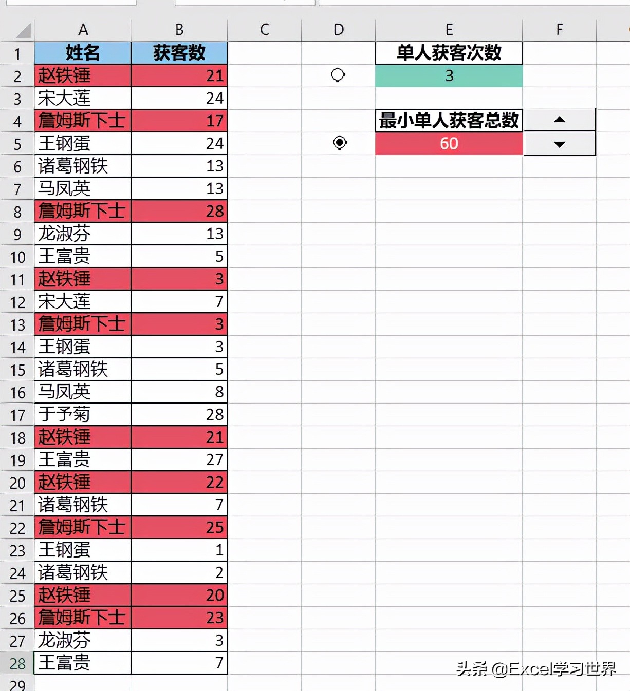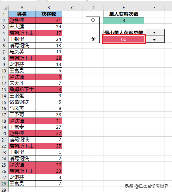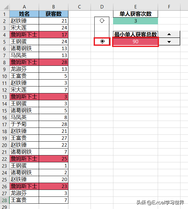 第二个条件格式也设置好了。选中下方的按钮,用控件调整 E5 单元格的数值,数据表中符合条件的行都会变成红色。