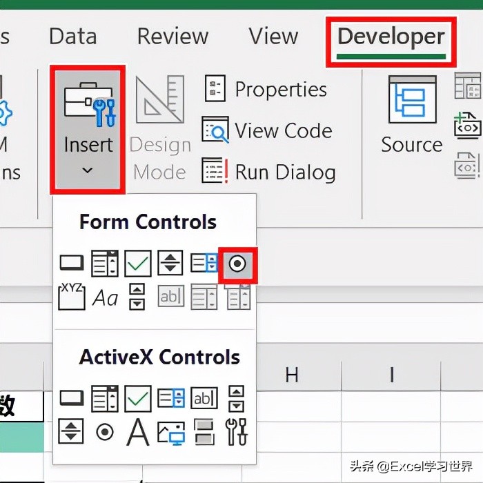 9. 选择菜单栏的“开发工具”-->“插入”-->“选项按钮”