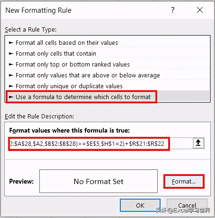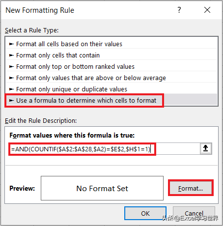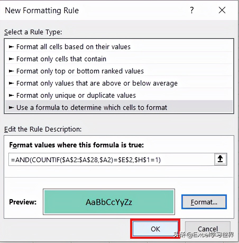 23. 在弹出的对话框中选择“使用公式确定要设置格式的单元格”--> 输入以下公式 --> 点击“格式”按钮: