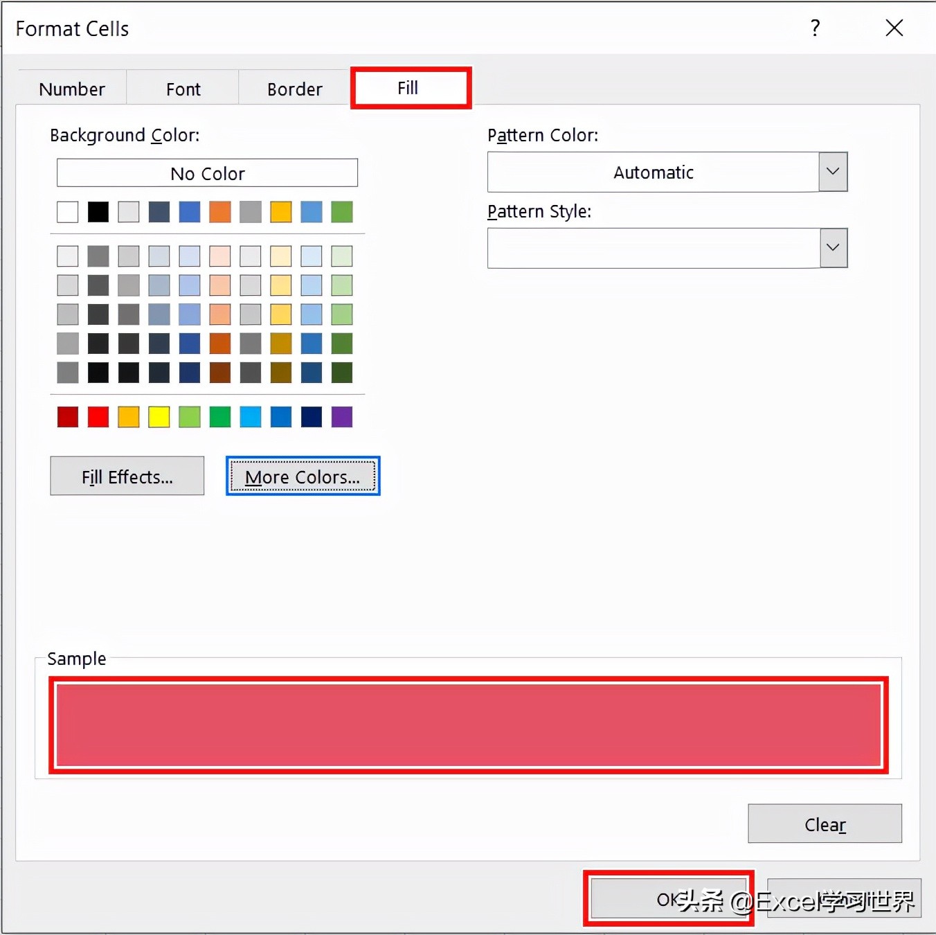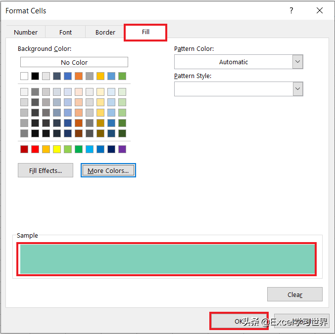 24. 在弹出的对话框中选择“填充”选项卡 --> 选择所需的填充色 --> 点击“确定”