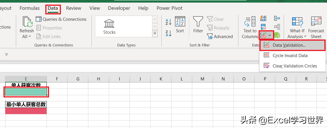 2. 选中 E2 单元格 --> 选择菜单栏的“数据”-->“数据验证”-->“数据验证”