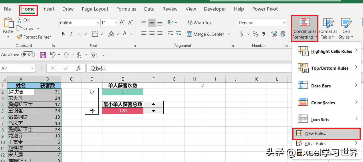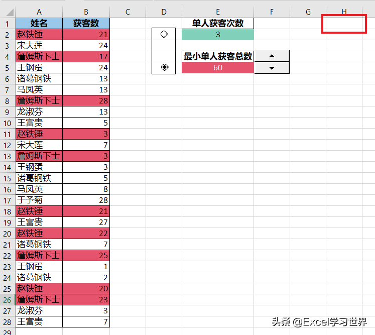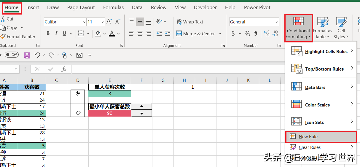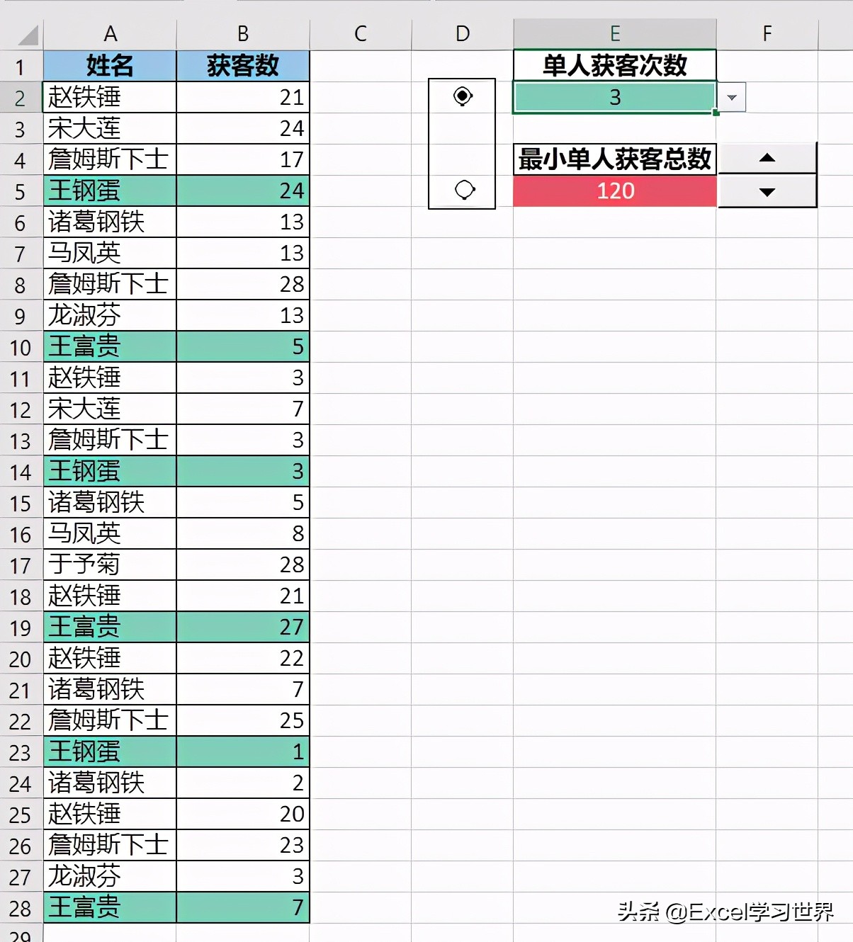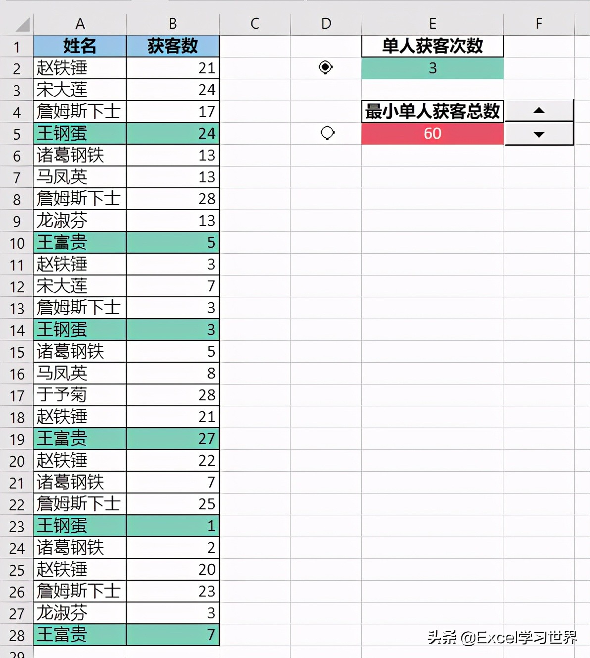 - 其一是将单人获客总次数符合指定数值的行标绿;