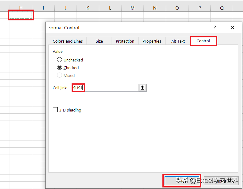 17. 在弹出的对话框中选择“控制”选项卡 -->“单元格链接”选择 H1 单元格 --> 点击“确定”