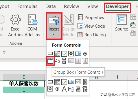 13. 选择菜单栏的“开发工具”-->“插入”-->“分组框”