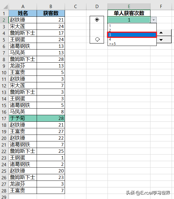 第一个条件就设置好了:选中上方的选项按钮,选择 E2 单元格中的菜单选项,数据表中符合条件的人就会整行高亮显示为绿色。
