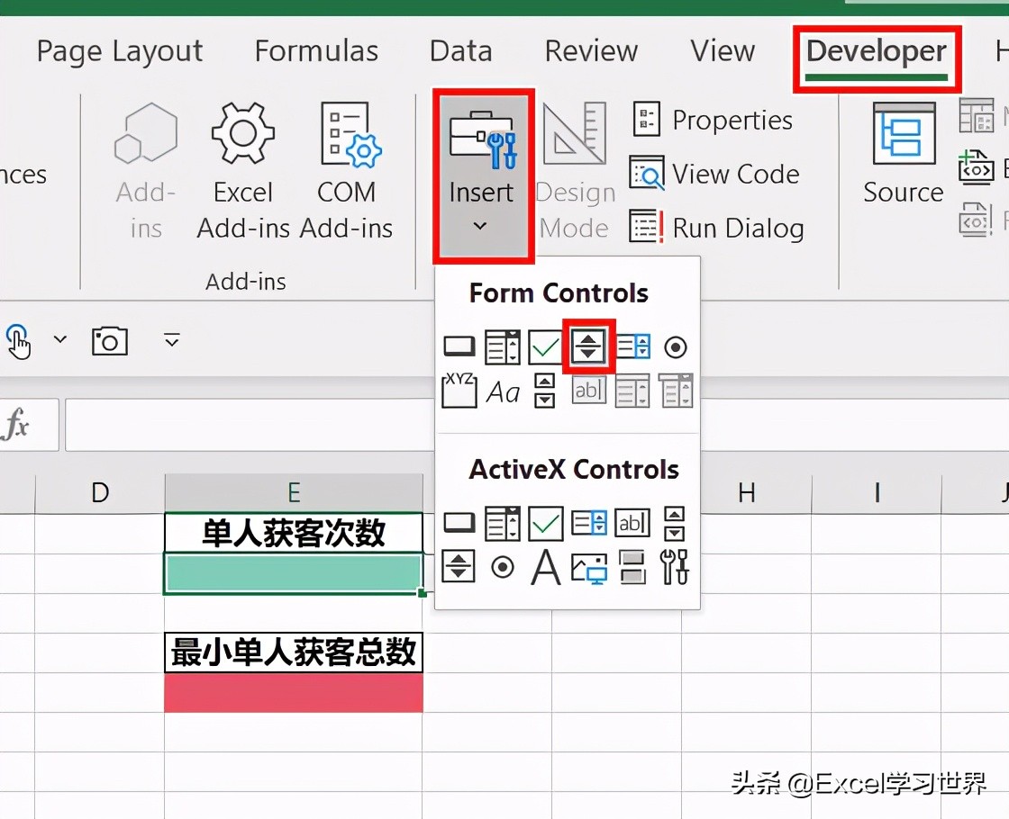 4. 选择菜单栏的“开发工具”-->“插入”-->“数值调节钮”