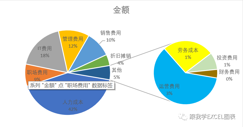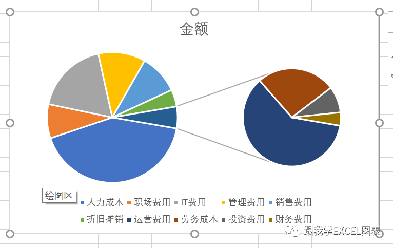 我们看到目前的左图的项目已经没有那么拥挤了,但是我想把折旧摊销也纳入其他中去,怎么做呢,我们点击饼图,将第二绘图中的值改为5,也就是我们表中的后5个项目。