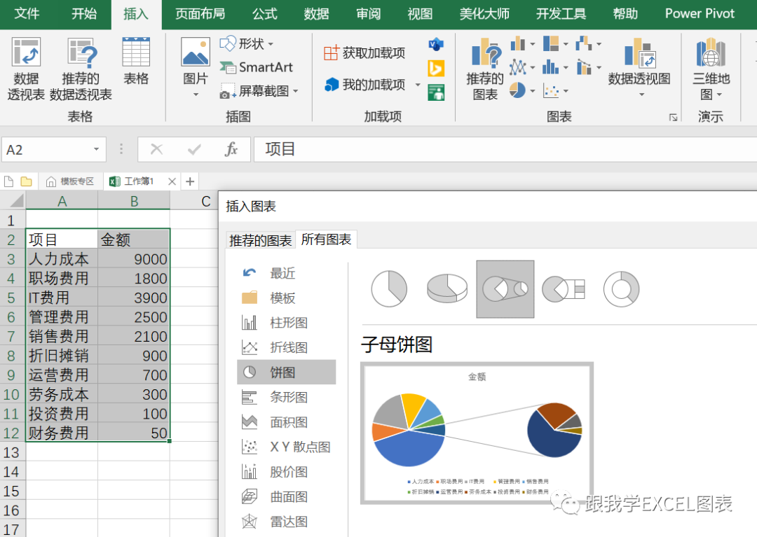 还是这些数据,我们排序最好是把数据小的项目放在下方,我们选择数据区域,然后点击插入-所有图表-饼图-子母饼图