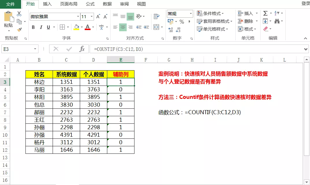 我们利用Countif函数条件计数的方式,可以快速统计对应数值出现的个数。当结果为1的时候说明对应两组数值相同,结果为0代表两组结果不相同。