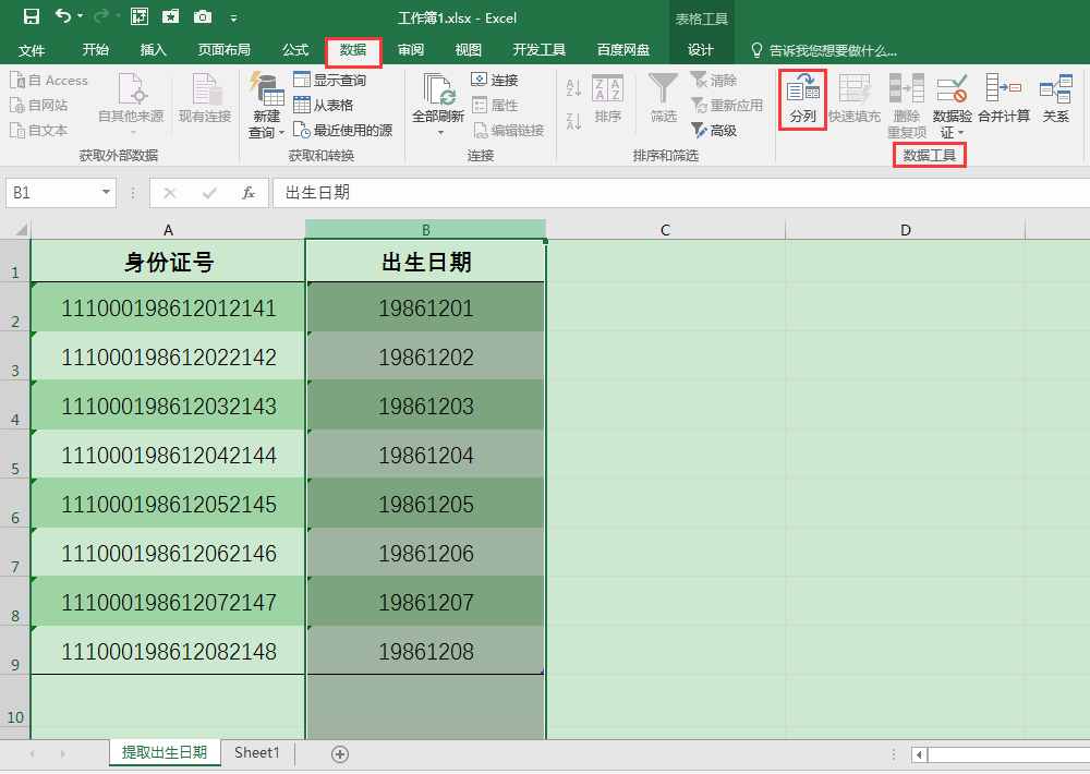 3、选中B列出生日期,在"数据"选项卡"数据工具"功能组中单击"分列"按钮。