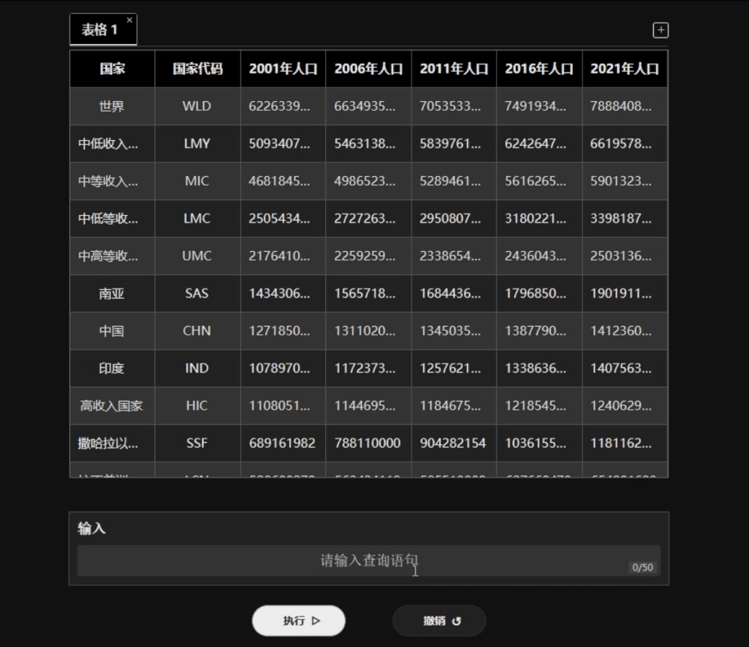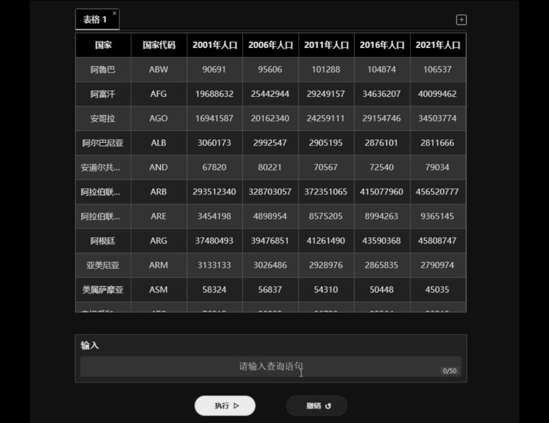 上面是表格预览,下面是聊天框和「执行」、「撤销」的按钮。