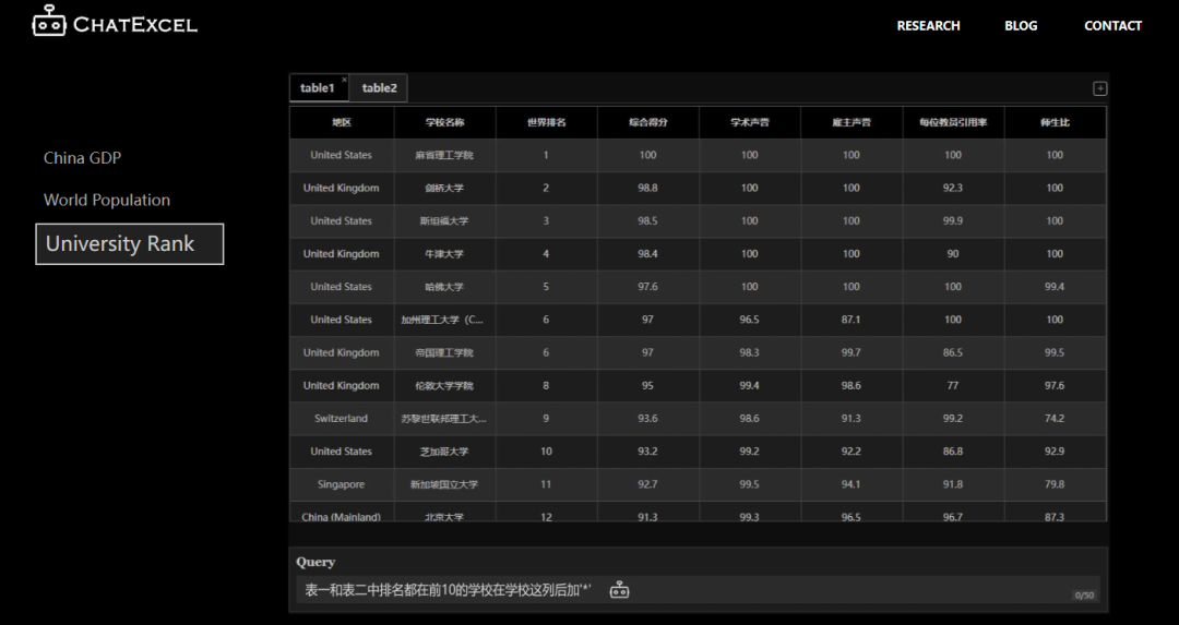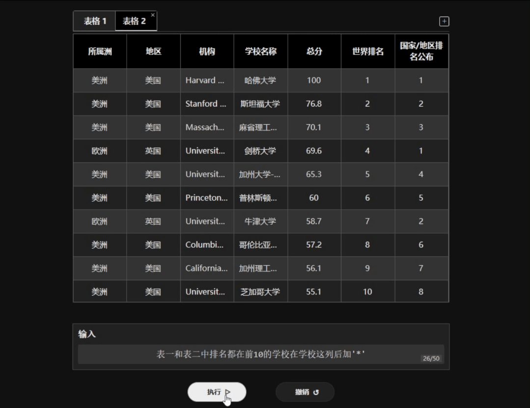 机哥让 ChatExcel 把两个表格中都排名前列的大学,加上一颗「*」。