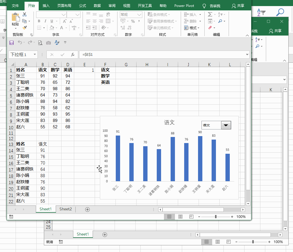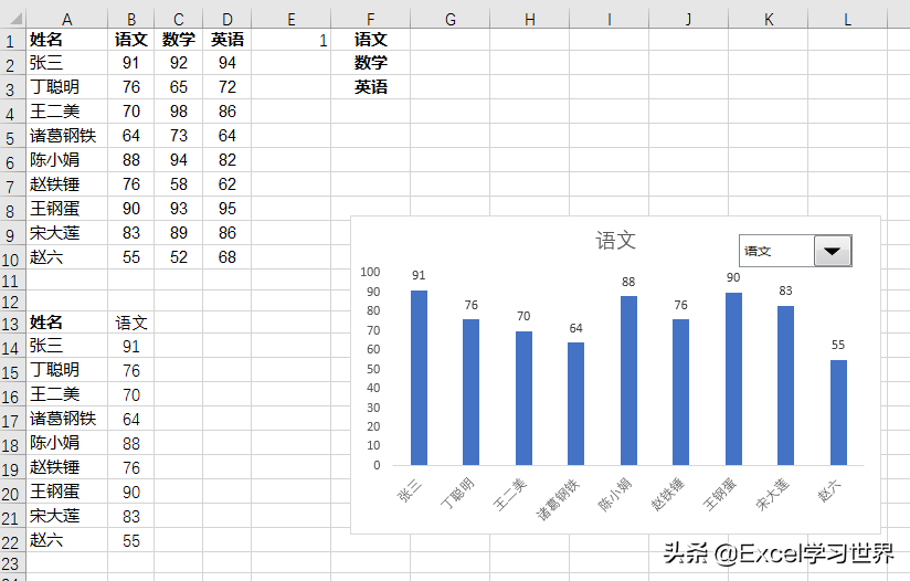 有关下图中的下拉菜单控制的动态图表案例,请参阅 制作一个可以用下拉菜单控制的 Excel 动态图表。