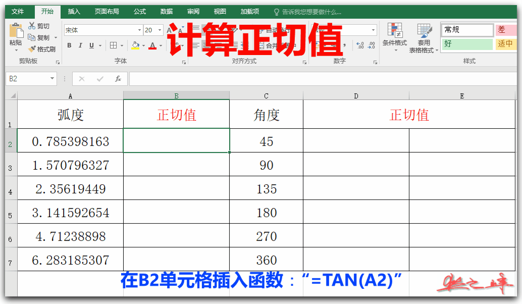 1)在B2单元格插入函数:“=TAN(A2)”,按【Enter】键确认;