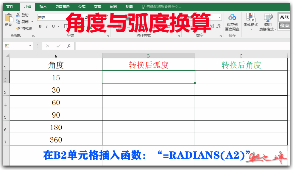 1、将角度转换为弧度(RADIANS函数):
