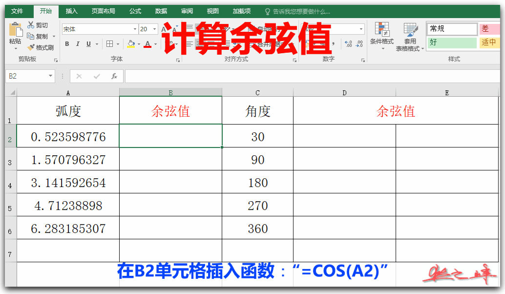 三、计算给定角度的余弦值(COS函数):