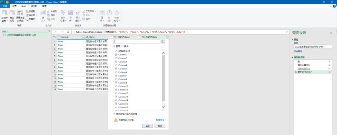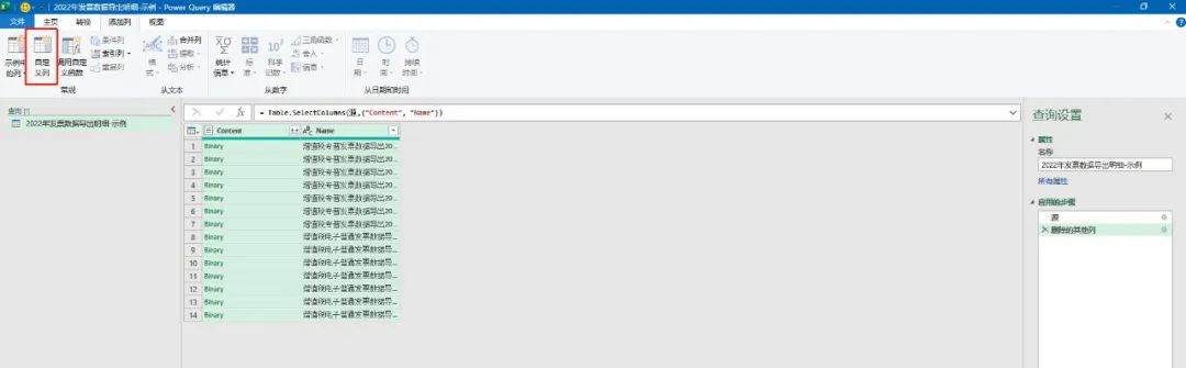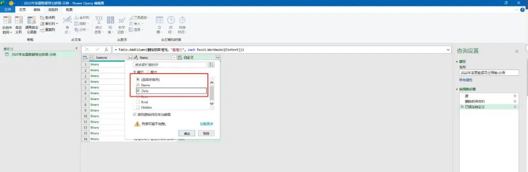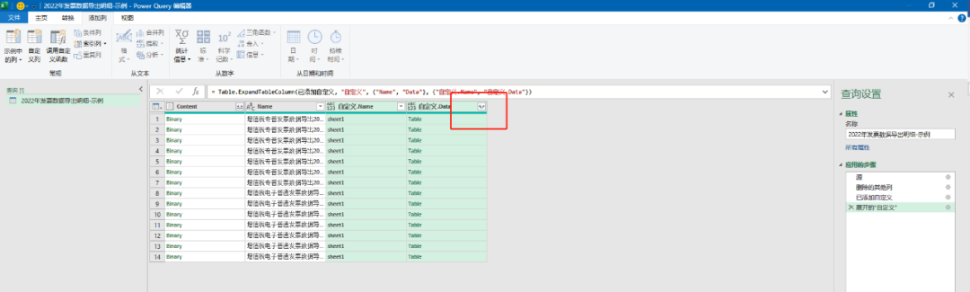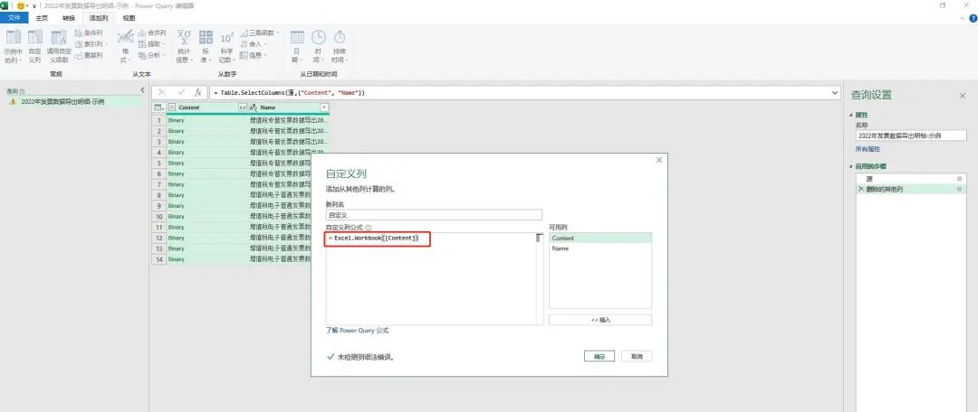 添加自定义列后录入:=Excel.Workbook([Content]),并点确定