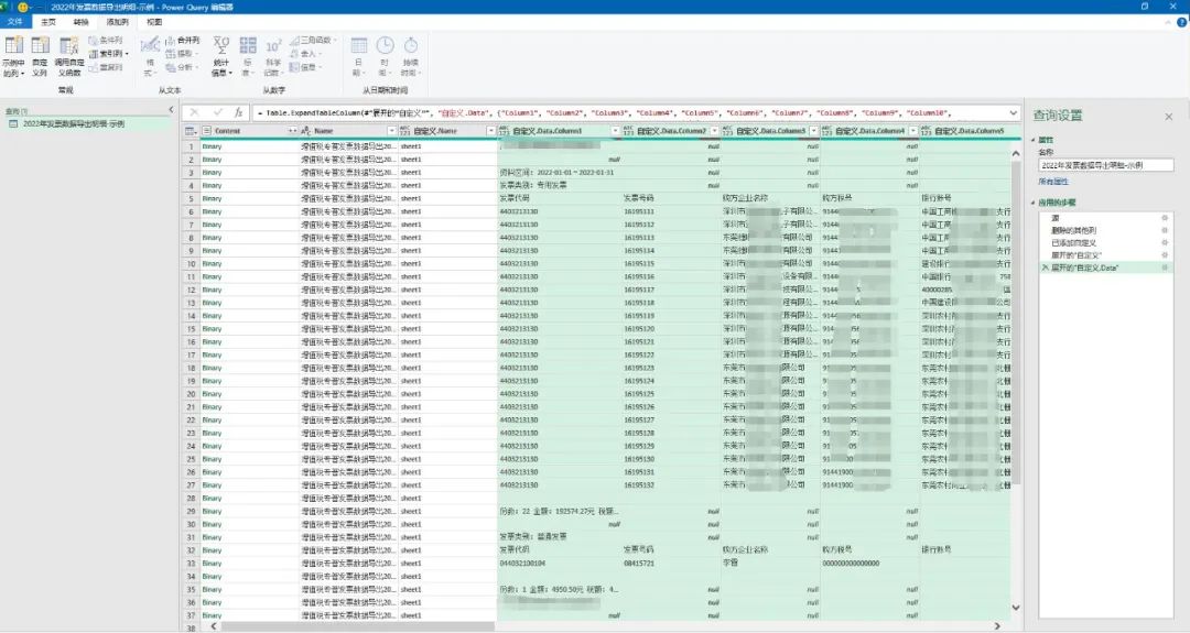 1-7月的发票明细数据下载到Power Query 查询器中。经整理清洗数据,导出如下表格,10几个文件直接合并加载到单个Excel文件。