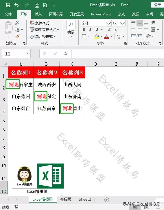 最重要的一步来了,我们直接鼠标框选选中A2:C4单元格数据区域,我们发现选中的区域内,所有单元格中的“河北”两个字符的字体颜色就变为了红色。如下图所示: