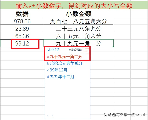 3、输入v+小数数字,可以得到对应的大小写金额,小数位数到2位。