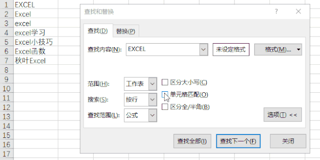 可实际上,小迷虫只是想要查找【EXCEL】,怎么办呢?当然是有办法的,我们可以勾选【单元格匹配】,更精准的来查找,方法如下: