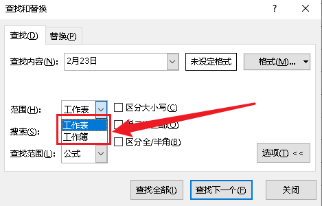 2、单击【选项】,将【范围】里默认的【工作表】改为【工作簿】,工作簿指的就是所有的表格,然后点击【查找下一个】或者【查找全部】就可以啦: