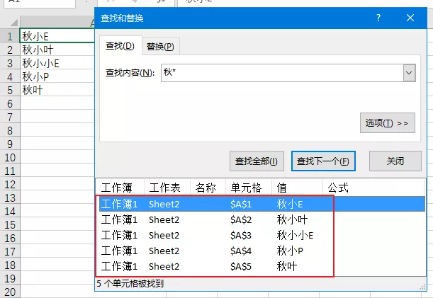 很简单,在【查找内容】中输入“秋*”,注意秋后面跟了一个*号,点击【查找全部】!
