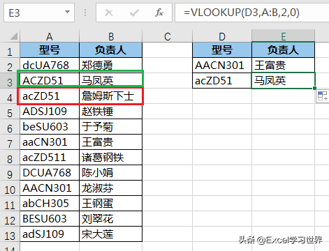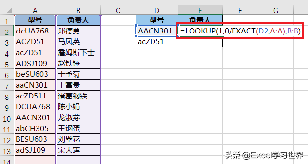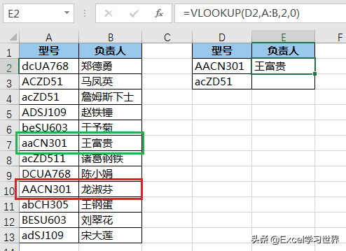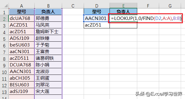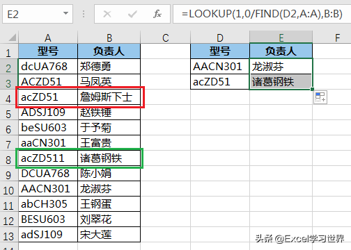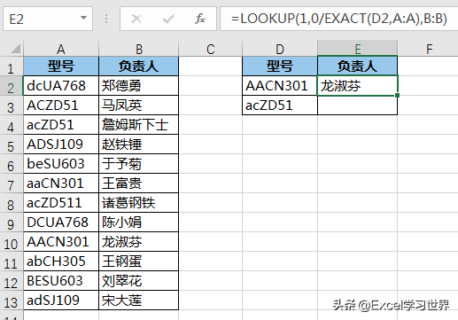 请根据 D 列中列出的型号,在 E 列查找出对应的负责人姓名。