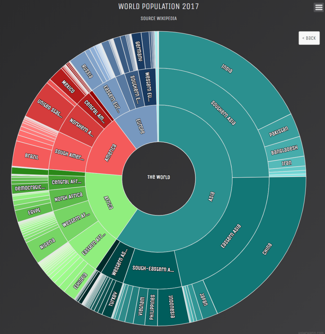 旭日图也常用于专业的大数据统计和分析中,下图是 2017 年世界人口数据的旭日图。