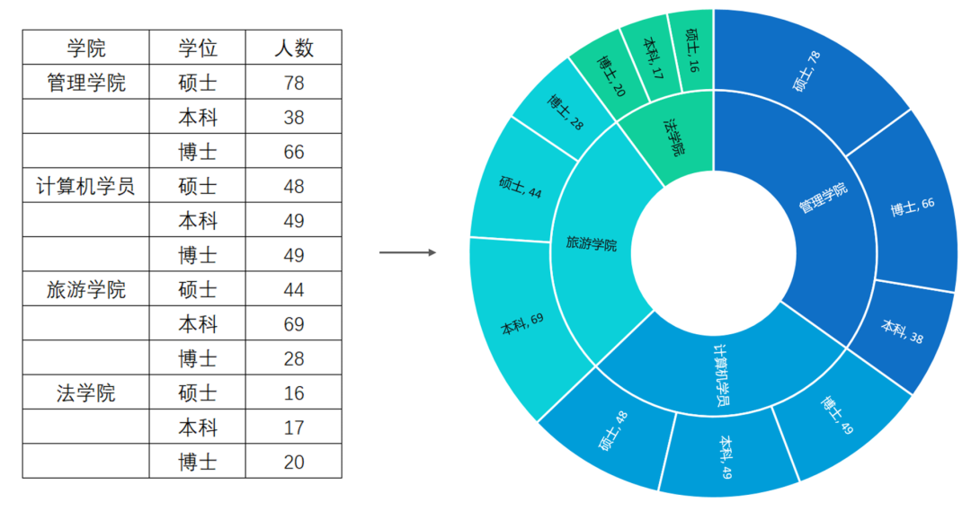 每个学院有不同本科、硕士、博士等不同学历的科研人员,用旭日图展示人员的构成: