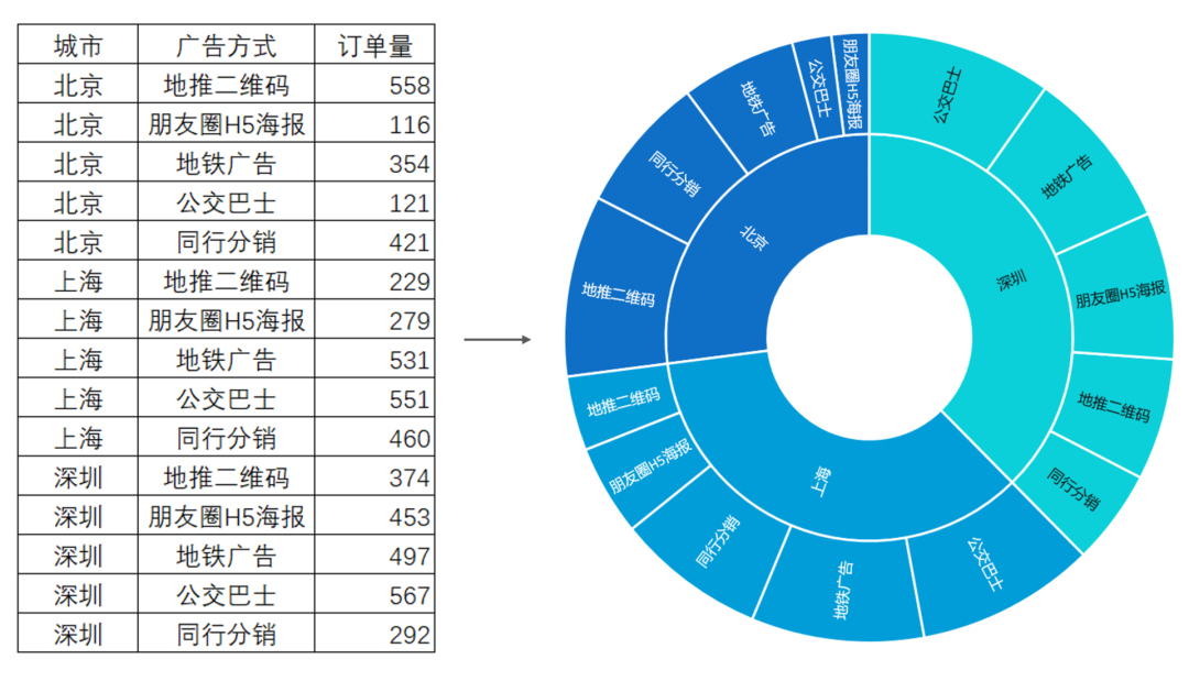 旭日图对数据源的要求可以说是非常低,无需对数据进行加工和改造,一维表是其最规范的格式。