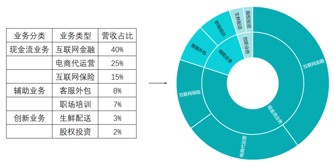 对公司业务类型进行梳理,用旭日图可展现每种业务的分类,以及营收占比情况: