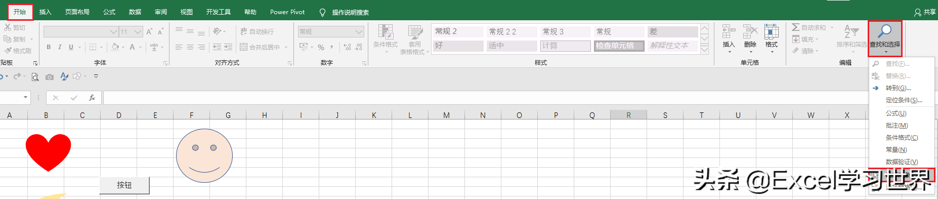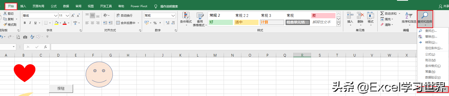 6. 选择菜单栏的“开始”-->“查找和选择”-->“选择对象”