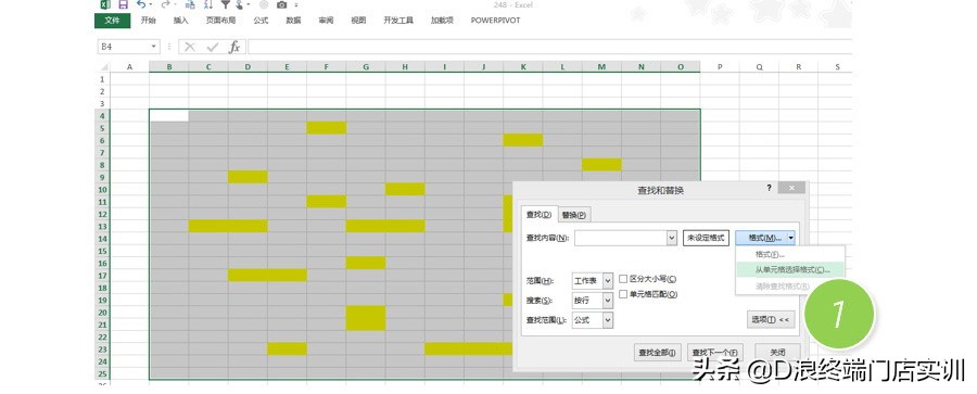 具体操作如下:选中“黄色”区域,然后按Ctrl+F 弹出查找窗口。在格式窗口中点击“从单元格选择格式”。(下图 1 处)